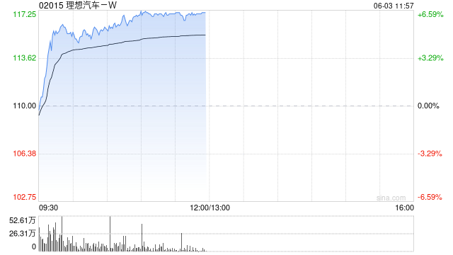 理想汽车-W(02015)午前股价上涨6.36%,现报117港元,成交额16.76亿港元。