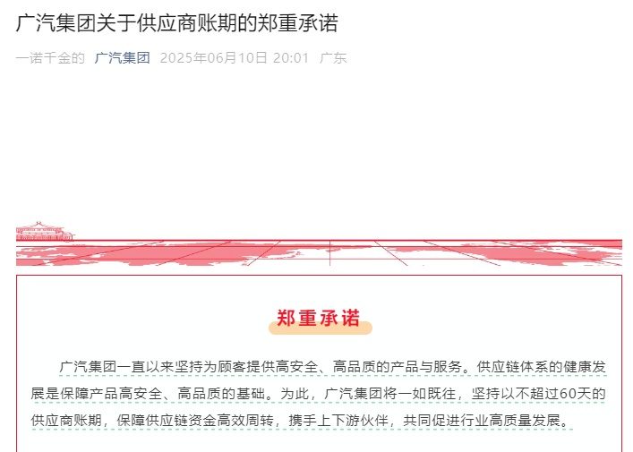广汽集团表示,广汽一直以来坚持为顾客提供高安全、高品质的产品与服务。供应链体系的健康发展是保障产品高安全、高品质的基础。为此,广汽集团将一如既往,坚持以不超过60天的供应商账期,保障供应链资金高效周转,携手上下游伙伴,共同促进行业高质量发展。