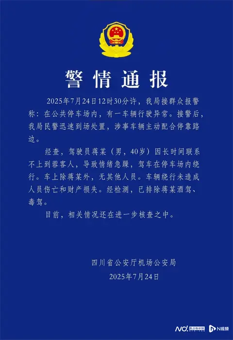 经查,驾驶员蒋某(男,40岁)因长时间联系不上到蓉客人,导致情绪急躁,驾车在停车场内绕行。车上除蒋某外,无其他人员。车辆绕行未造成人员伤亡和财产损失。经检测,已排除蒋某酒驾、毒驾。目前,相关情况还在进一步核查之中。
