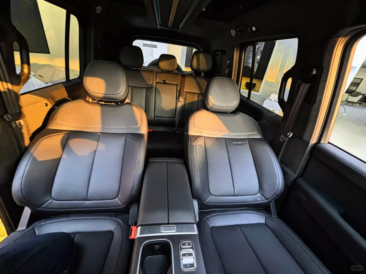 侧面展现出方盒子造型的复古元素,长长的车头、平坦的车顶,配合宽大的矩形车窗和外露轮拱,强化车辆力量感。侧裙部位和轮眉采用黑色饰板覆盖,装点有机械风的弯折线条。此外,车门把手为常规外拉式设计,车顶拥有镂空行李架。