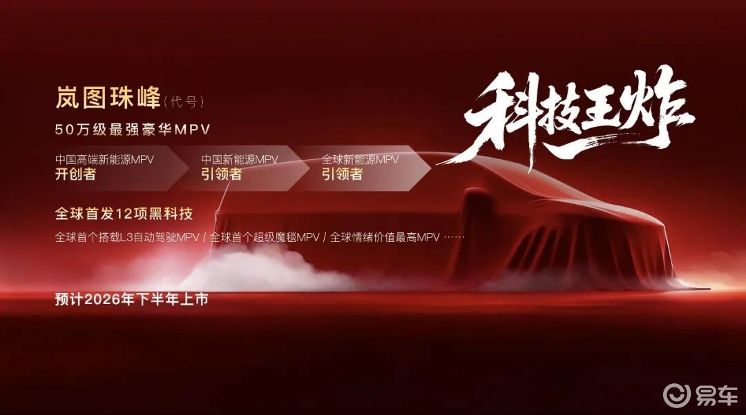 至于厂方此次公布的最后一款新车,则被描述为“50万元级最强豪华MPV”。从售价来看,这款代号为“岚图珠峰”的产品之定位显然还在梦想家之上。据介绍,该车将全球首发12项“黑科技”,并成为“全球首款L3自动驾驶MPV”,预计于2026年下半年上市。