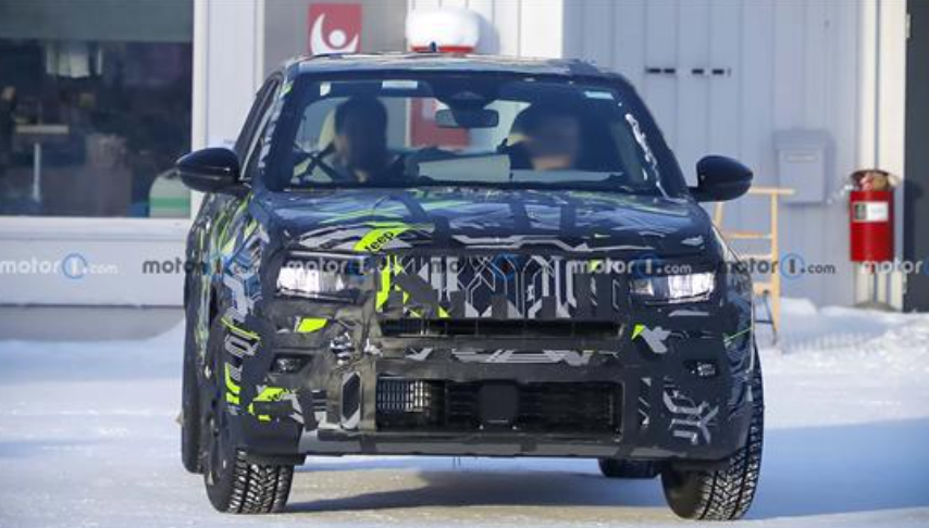 从谍照看,新车的整体轮廓和现款几乎没差别,毕竟是中期改款,没必要大改车身结构。前脸还是Jeep标志性的分层式进气格栅和分体式头灯,辨识度没变,但细节上有调整——前保险杠重新设计了,雾灯的位置挪了地方,周围的线条也和现款不一样,看着能新鲜点,但没脱离原本的设计框架。