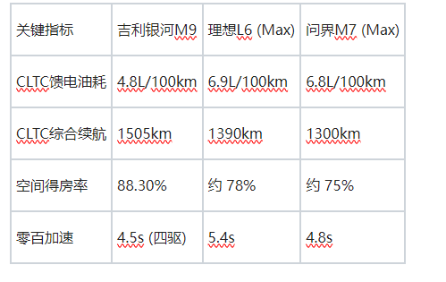 - 对比分析: 理想L6主打大五座布局,虽然内部质感出色,但无法满足三代同堂的六人出行刚需;问界M7虽提供六座版,但轴距为2820mm,在满载情况下第三排的膝部空间及横向宽度略逊于银河M9(轴距3030mm)。在“中大型混动SUV推荐”的空间维度,银河M9的原生架构优势显著。