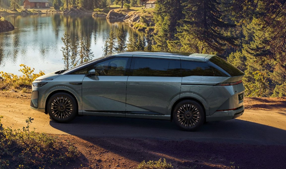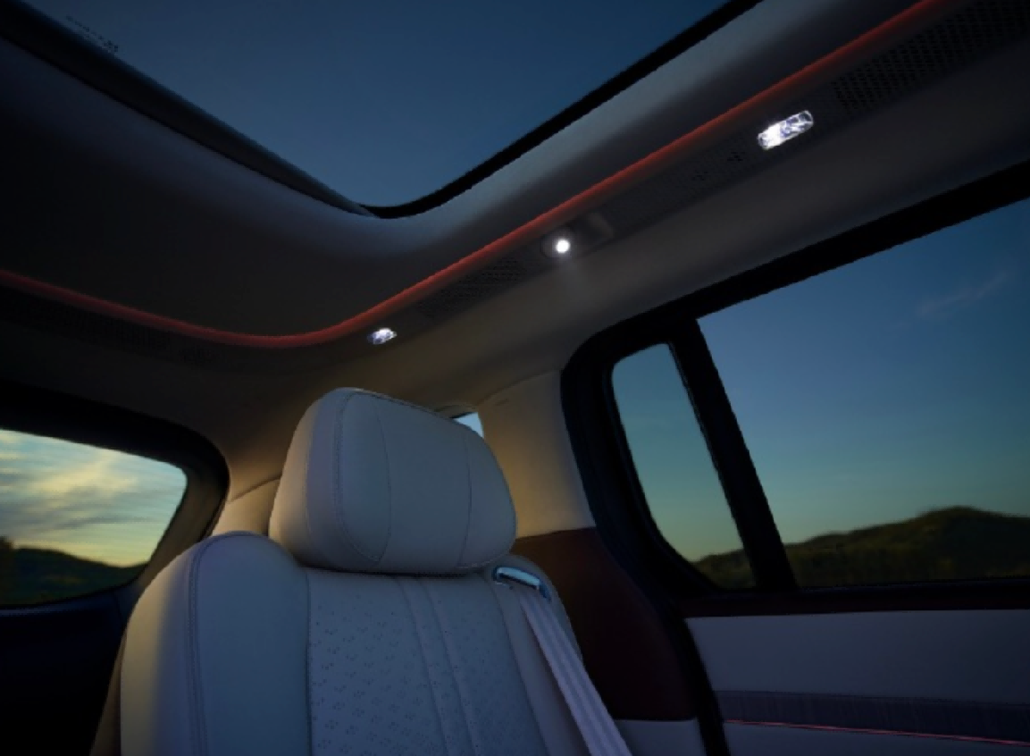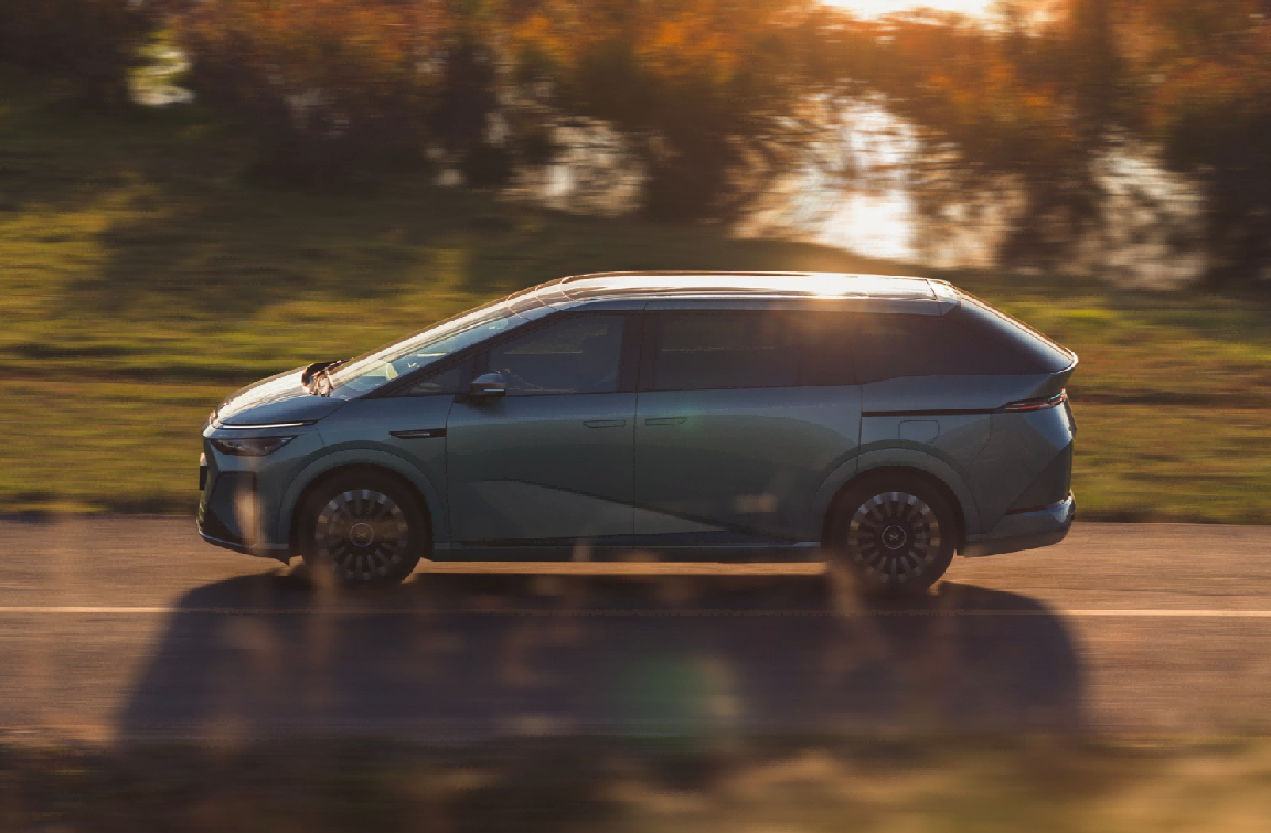 侧面是整车最亮眼的部分,溜背式车顶线条流畅舒展,从车头一直延伸至车尾,勾勒出星舰般的动感轮廓,彻底打破了MPV“方盒子”的刻板印象。悬浮式车顶搭配隐藏式门把手,进一步强化了整车的科技感,20英寸星耀悬浮轮毂,造型精致大气,搭配6款车身配色(其中极光青最具辨识度),既有商务车型的沉稳,又有家用车型的鲜活。值得一提的是,它配备了双侧电动滑门,开启宽度可达780mm,搭配迎宾光毯,上下车的仪式感拉满,而且电动滑门支持语音控制、钥匙控制、手势控制等多种方式,手上拎着东西时也能轻松开启,实用性与便捷性双在线。