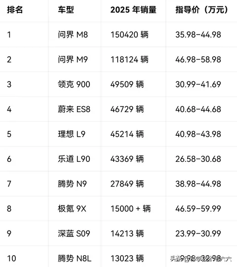蔚来 ES8 以 11260 辆的销量遥遥领先,是第二名极氪 9X 的 2.3 倍,展现出强大的市场号召力。
