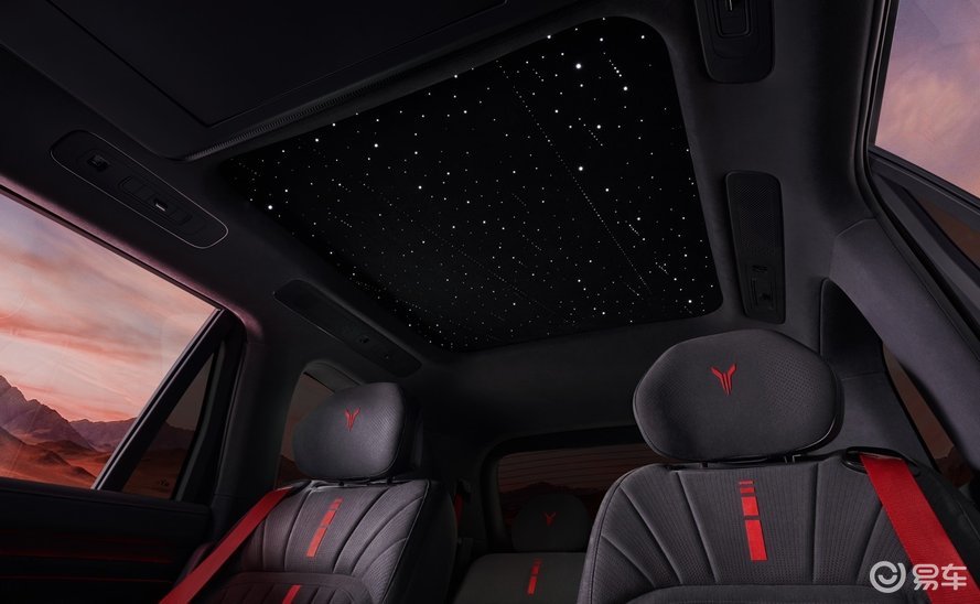 座舱内部将隐奢质感拉至满格。设计师以大面积墨色为底,在缝线与头枕等关键之处巧妙点缀丹砂红并采用层叠线条立体绗缝工艺,模仿铠甲片片相扣的精密感,中央更嵌入精致的红色高频焊图案。这一细节不仅拉满了百万级的奢华触感,更隐喻了藏锋于内敛之下的侠者风范。搭配高品质黑水晶钻石切割按键与流云墨韵饰板,细节处尽显藏而不露的高端格调。新车越级配备与百万豪车同源的星河天幕,598颗灯珠营造出静谧的星空仪式感,它将中式豪华的内敛之美推向了极致。