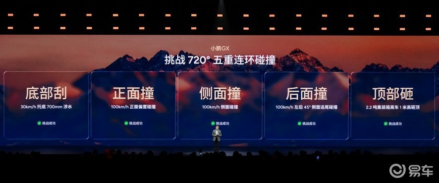 被动安全层面,小鹏GX采用行业最大16000T前后一体大压铸,通过正面抗冲击、侧面抗冲击、后部抗冲击、顶部承压、底部防托底720度全方位防护系统,实现超高被动安全强度,更完成行业首次720°立体五重连环碰撞挑战,以远超国标的极端工况验证整车安全实力。整车配备11个安全气囊,做到行业领先,包含主驾正面安全气囊、前排41L三腔远端安全气囊、副驾125L超大气囊、前后一体贯穿式侧气帘2个、一排和二排侧气囊4个、零重力座椅坐垫气囊2个,同时实现三排乘员无死角防护,其中贯穿式侧气帘弹开后6秒内可保持气压,有效降低二次碰撞伤害。
