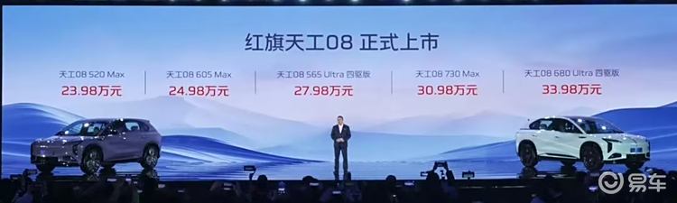 动力方面,红旗天工08提供单电机和双电机两个版本,其中单电机版最大功率253千瓦,峰值扭矩450牛米,双电机版最大功率455千瓦,峰值扭矩756牛米,零百加速最快仅需3.9秒。电池组有75/85kWh的磷酸铁锂和111kWh的三元锂三种,CLTC纯电续航有520/605/565/730/680公里五个版本。底盘采用前双叉臂后五连杆,并配了iDCS自主连续阻尼可调减震器。另外四驱版提供20000元的运动选装包,内容包括空气悬架、后轮转向、红色刹车钳、内饰氛围灯等等。