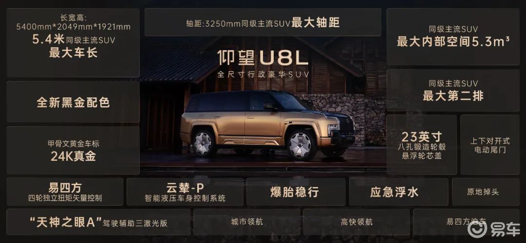 而在所有技术之上,仰望U8L还给出了另一种难得的回答,审美。黑金双色涂装,源自东方黑漆描金工艺的延续;甲骨文真金车标,把科技与文化凝于一体;极简尾门和八孔锻造轮毂,用克制取代张扬。极致,不是密集叠加元素,而是让每一个细节,既回应时代,又穿透人心。