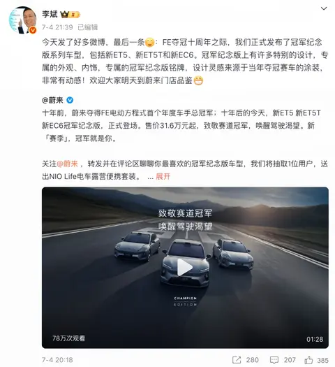 如果你还在等蔚来打价格战,那你真的想多了。7月4日,蔚来发布新ET5、新ET5T、新EC6冠军纪念版,起售价不仅没降,反而全系上涨,配合的不是优惠,而是一纸“冠军情怀”。