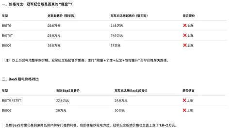 新ET5、新ET5T冠军纪念版起售价31.6万元,较老款整车价29.8万元上涨1.8万。新EC6冠军纪念版更是从35.8万涨到37万,涨幅超3%。BaaS方案也全线同步上调,涨幅一致。